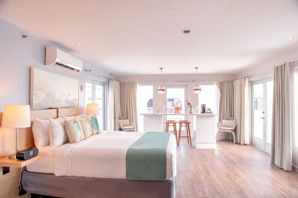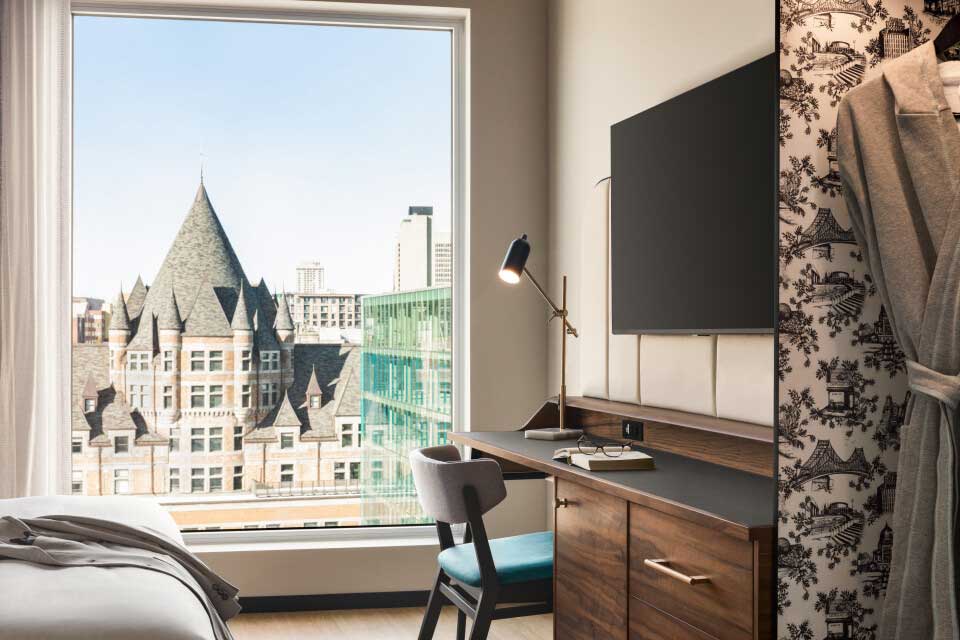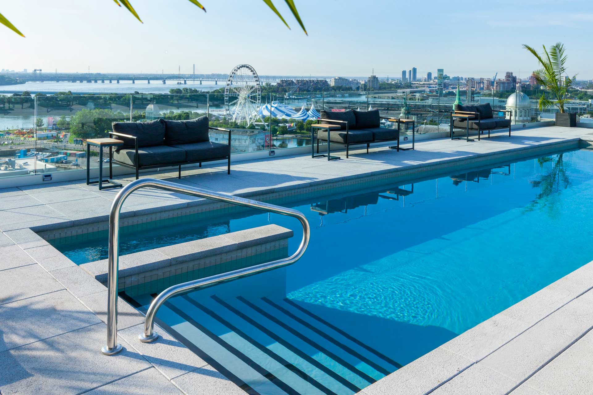 It also features a stunning 14th-floor rooftop bar boasting 130 seats and breathtaking 360-degree views of Old Montréal, the majestic St. Lawrence, and the bustling downtown Montreal skyline.